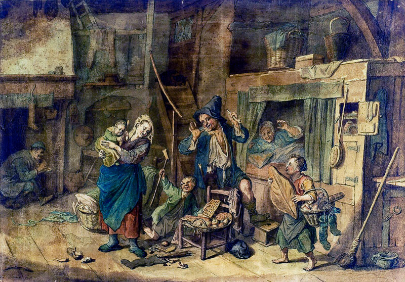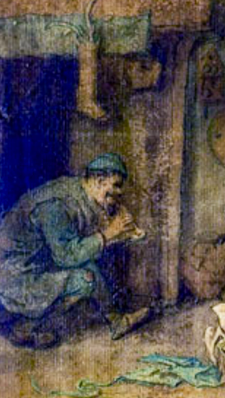 bij de haard zien we iemand die zich wat geheimzinnig ophoudt. Net zoals we dit gezien hebben bij de schilderijen van Richard Brakenburgh en Jan Steen.