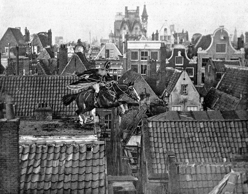 Sinterklaas springt met zijn paard over de daken van Amsterdam, december 1916. Omdat zijn stoomboot door de Engelsen is aangehouden, de zakken met pepernoten door hen in beslag zijn genomen en Piet is aangehouden omdat hij zich niet voldoende als Nederlander kon identificeren, staat de Goedheiligman er in dit Eerste Wereldoorlogsjaar alleen voor. Hij moet zich extra haasten om de kinderen van Nederland op tijd van de overgebleven geschenken te voorzien.
