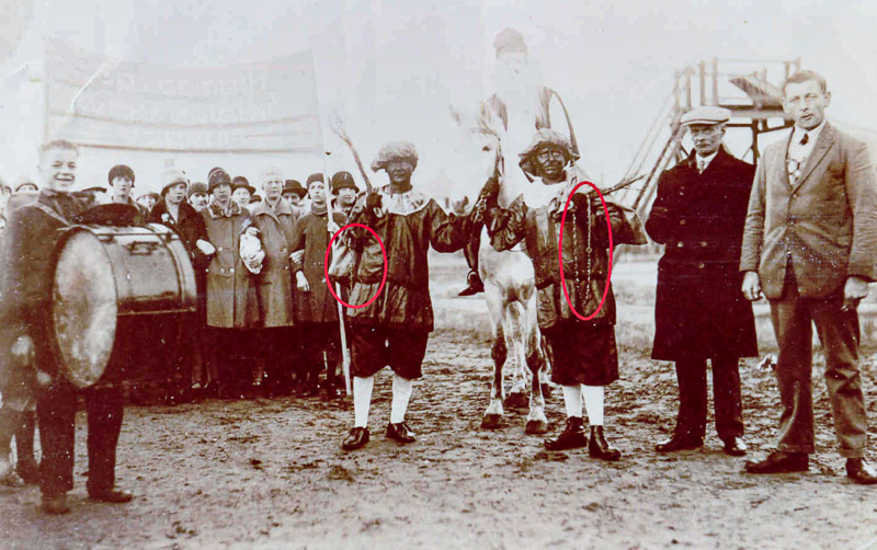 De Zwarte Pieten hebben een pikzwarte maskerade en dragen geen pruik. Beide Pieten hebben een roe, zak en een ketting.