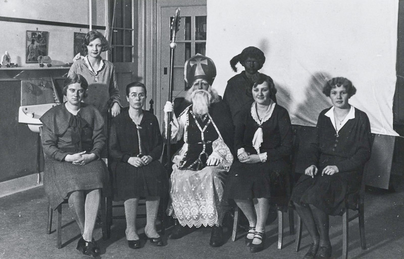 Onderwijzeressen van School B aan de Bothastraat met Sint-Nicolaas en Zwarte Piet.