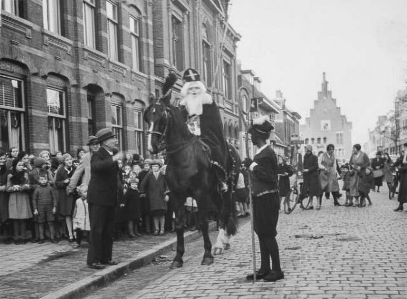 Intocht van Sinterklaas en Zwarte Piet in Waalwijk. Sinterklaas staat met zijn paard in de Stationsstraat voor de tekenschool, een groep kinderen staat toe te kijken.