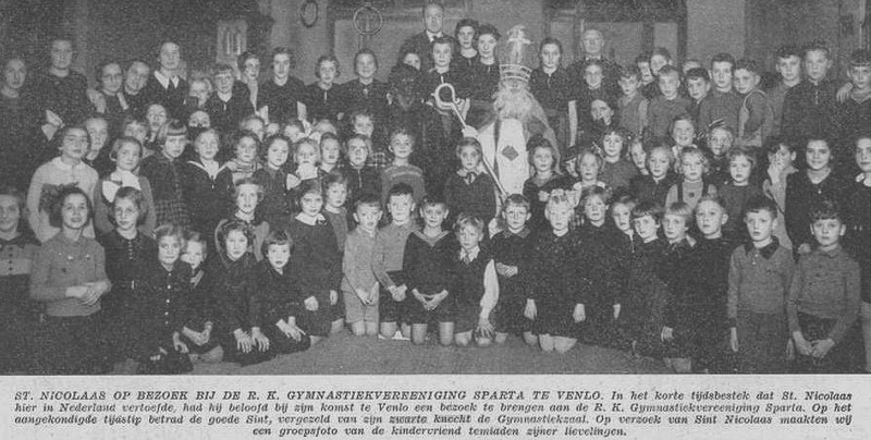 ST. NICOLAAS OP BEZOEK BIJ DE R. K. GYMNASTIEKVEREENIGING SPARTA TE VENLO. In het korte tijdsbestek dat St. Nicolaas hier in Nederland vertoefde, had hij beloofd bij zijn komst te Venlo een bezoek te brengen aan de R. K. Gymnastiekvereeniging Sparta. Op het aangekondigde tijdstip betrad de goede Sint, vergezeld van zijn zwarte knecht de Gymnastiekzaal. Op verzoek van Sint Nicolaas maakten wij een groepsfoto van de kindervriend temidden zijner lievelingen.