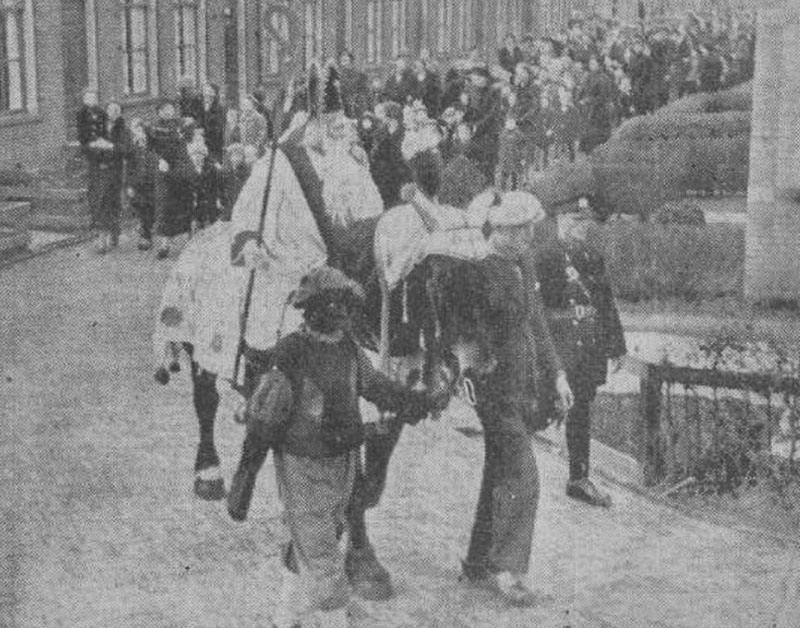HET JAARLIJKSCHE ST. PIETERFEEST TE GROUW. — Sint Pieter geheel gekleed als Sint Nicolaas, doet met zijn zwarten knecht Hansje Plus zijn intocht in het dorp. Dit is voor de jeugd „het” feest van het jaar.