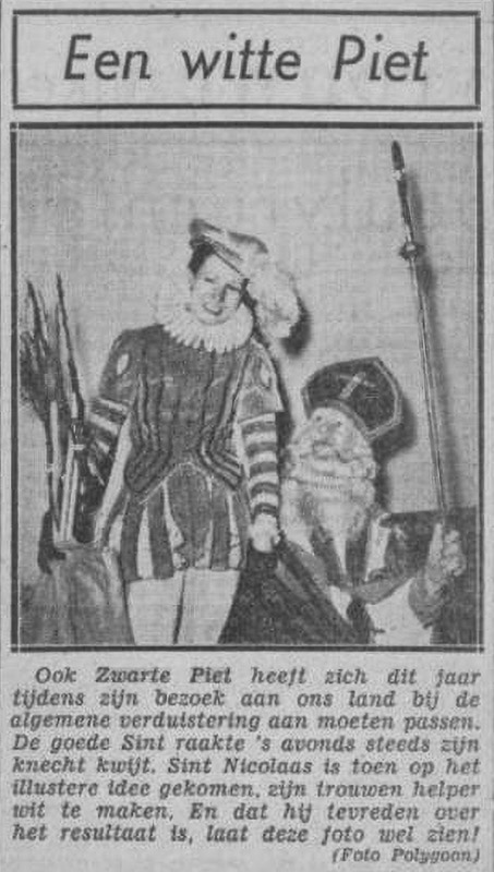 Zonder de tekst eronder gaat deze foto rond als ‘bewijs’ dat witte Pieten ooit gangbaar waren. Dit is onjuist. Het is een protest tegen de verduisteringsmaatregelen in de Tweede Wereldoorlog.