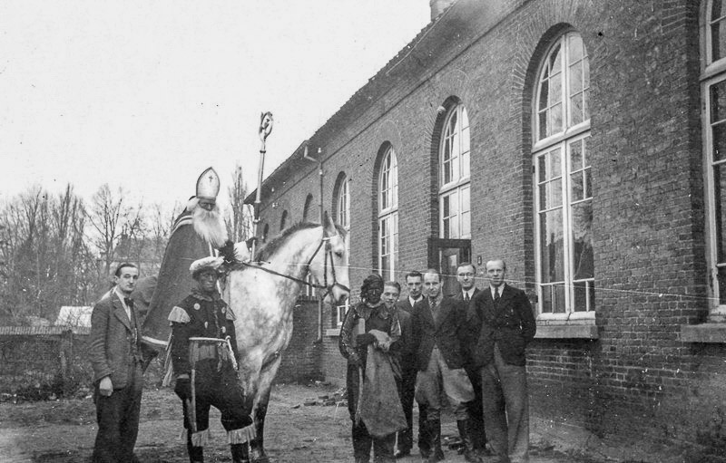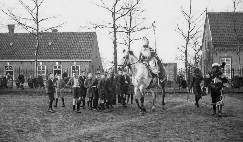Intocht Sinterklaas en Zwarte Pieten voor de oude Jongensschool, nu het Johan Frisoplein.