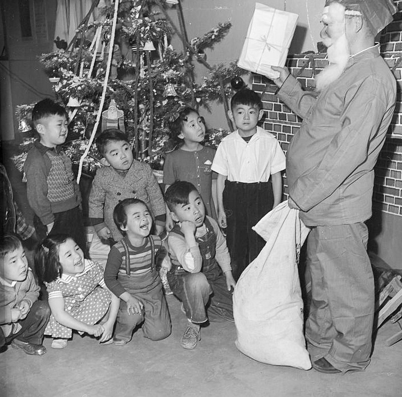 Granada Relocation Center, Amache, Colorado. In his Santa Claus mask, wearing a pair of red pajamas, Chief Steward Matsumoto of Block 7-H at the Granada Relocation Center was Santa Claus for Christmas Eve. The children had no trees in their barracks room homes, but each mess hall provided a Christmas tree, and presents, many sent from Church groups throughout the country, were distributed to the children.