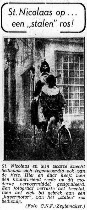 St. Nicolaas en zijn zwarte knecht bedienen zich tegenwoordig ook van de fiets. Hier en daar heeft men den kindervriend reeds op dit moderne vervoermiddel gesignaleerd. Een fotograaf verraste het tweetal, toen het zich bij gebrek aan een ‘havermotor’ van het ‘stalen’ ros bediende. (Foto C.N.F./Zeylemaker.)