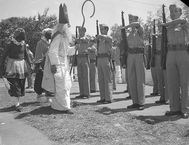Soerabaja, 5 december 1948 – Sinterklaas wordt geëscorteerd door twee Zwarte Pieten en inspecteert het erepeloton mariniers.