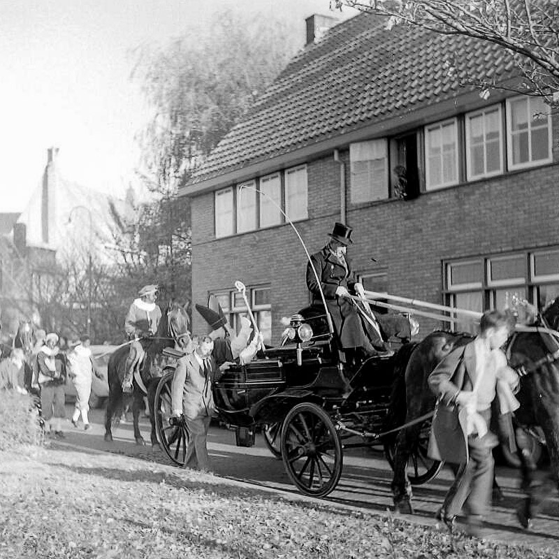 Intocht in Middelburg op Walcheren, Sint in een koets en Zwarte Piet op een paard erachter.