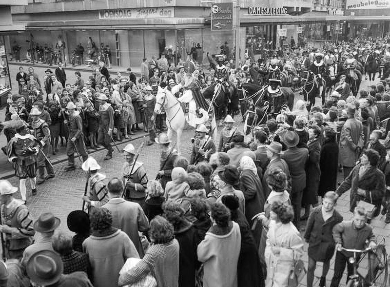 Bij de landelijke intocht in 1960 te Rotterdam, rijden de Zwarte Pieten op paarden.