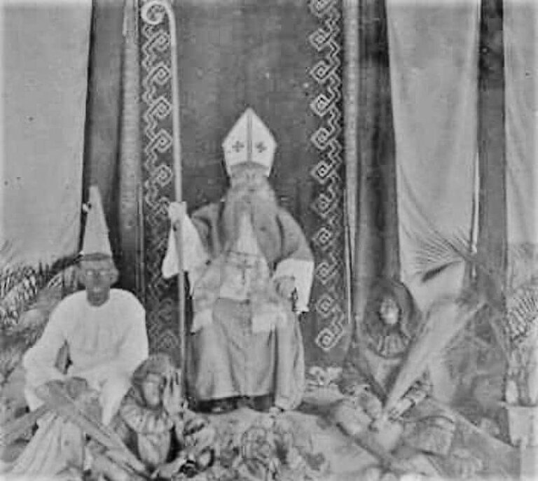 1911 – Sint, twee Zwarte Pieten en een figuur met puntmuts Onderwerp: bang makenmeerdere PietenPiet zonder pruikroe/gardSinterklaaszwart schminkheiligeTijd: 1901-1950Regio: Buiten EuropaIndonesiëSoort: foto Lees meer