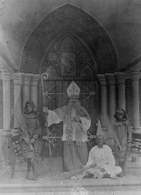 1911 – Sint, twee Pieten en figuur met puntmuts Onderwerp: bang makenroe/gardSinterklaaszwart schminkZwarte PietheiligeTijd: 1901-1950Regio: Buiten EuropaIndonesiëSoort: foto Lees meer