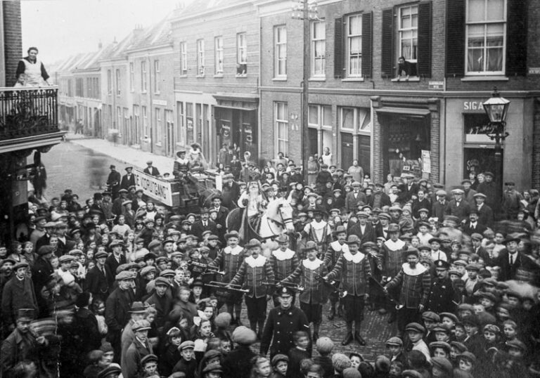 1934 – Sinterklaasintocht met 7 Pieten Onderwerp: herautenintochtmeerdere Pietenpaardroe/gardzak/mandzwart schminkTijd: 1901-1950Regio: NederlandWest: Noord-Holland, Zuid-Holland, UtrechtSoort: foto Lees meer